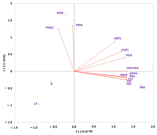 Biplot analysis of phenolic contents and biological activities in native Australian lemon aspen (LA), rosella (R), strawberry gum (SBG), and mountain pepper berries (MPB).