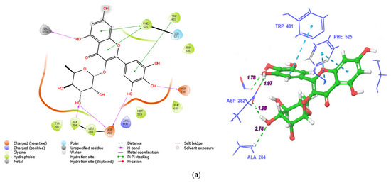 All compounds were properly docked in 5NN8. Myricitrin (Figure 4A) and quercitrin made two hydrogen bonds with ASP 282 (negatively charged) and one each with ASP 616 (negatively charged), ALA 284 (hydrophobic), and EDO 1024. They had double Pi–Pi stacking hydrophobically with PHE 525 and a single Pi–Pi bond with TRP 481. Chlorogenic acid (Figure 4B) made two hydrogen bonds with ASP 282, one hydrogen bond each with ASP 518 and ASP 404, and one with a water molecule; and it had π–π staking with the hydrophobic PHE 649. Quercetin 3-(2-galloylglucoside) made hydrogen bonds with ASP 282 (negatively charged), ASP 616 (negatively charged), ASP 518 (negatively charged), ASP 404 (negatively charged), ALA 284 (hydrophobic), ARG 600 (positively charged), PHE 525 (hydrophobic) and water molecules; and Pi–Pi bonds with TRP 481, PHE 525, and PHE 649. Moreover, delphinidin 3-rutinoside, delphinidin 3-sambubioside, and rutin made four hydrogen bonds (two with ASP 616, one with ASP 404, and one with ASP 518), six hydrogen bonds (two ASP 282 and one each with ASP 518, ASP 403, EDO 1024, and a water molecule), and six hydrogen bonds (ASP 282, ASP 404, ASP 518, ASP 616, ASN 524 and SER 523); they also had π–π stacking in one (TRP 481), two (TRP 481 and PHE 649), and four (two with PHE 649, one with TRP 481, and one with TRP 376) bonds, respectively. Acarbose made twelve hydrogen bonds (two each with ASP 518, ASP 404, ASP 282, and SER 523; three OH groups from water molecules, which further made hydrogen bonds with ASP 645 and ARG 281). Naringin made hydrogen bonds with ASP 282, PHE 525, LEU 678, EDO 1024, and ARG 281 and one Pi–Pi stacking interaction with TRP 481. Furthermore, diosmin made three hydrogen bonds with the negatively charged ASP 282 and one with the negatively charged ASP 616 (Figure S3). The binding energies of quercetin 3-(2-galloylglucoside), delphinidin 3-rutinoside, cyanidin 3-O-rutinoside, delphinidin 3-sambubioside, rutin, acarbose, cyanidin 3-rhamnoside 5-glucoside, delphinidin, procyanidin B2, myricitrin, 3-feruloylquinic acid, taxifolin, diosmin, quercitrin, chlorogenic acid, naringin, 3-p-coumaroylquinic acid, myricetin, quercetin, isorhamnetin, quinic acid, luteolin, (-)-epicatechin, hesperetin, and gallic acid in 5NN8 were calculated as − 11.09, − 11.08, −10.90, −10.38, −10.14, −9.65, −9.46, −8.48, −8.05, −7.59, −7.32, −7.13, −6.84, −6.72, −6.62, −6.40, −6.35, −6.28, −5.95, −5.68, −6.65, −5.52, −5.36, −5.28, and −5.15 kcal/mol, respectively (Table S3). From the given results, it is predicted that quercetin 3-(2-galloylglucoside) identified in strawberry gum has higher α-glucosidase-inhibiting activity than acarbose. Overall, flavonoids are predicted to have higher binding affinities than the other selected phenolic compounds. Interestingly, 3-feruloylquinic acid has a higher binding affinity than taxifolin, diosmin, quercitrin, naringin, myricetin, quercetin, isorhamnetin, and luteolin chlorogenic acid; and 3-p-coumaroylquinic acid has a higher binding affinity than myricetin, quercetin, isorhamnetin, luteolin, (-)-epicatechin, hesperetin, diosmetin, and naringenin (Table S3). In silico molecular docking is a prediction of possible interactions between target proteins (5NN8) and potential inhibitors. Therefore, it is critical to assess the inhibitory activities of individual purified phenolic compounds to establish the precise roles of individual bioactive compounds in the inhibition of α-glucosidase. Moreover, the insights into inhibitory mechanisms of bioactive polyphenolic compounds against α-glucosidase and other proteins involved in diabetic conditions can be revealed through advanced molecular dynamics techniques and free-energy calculations, and through inverse molecular docking [61].