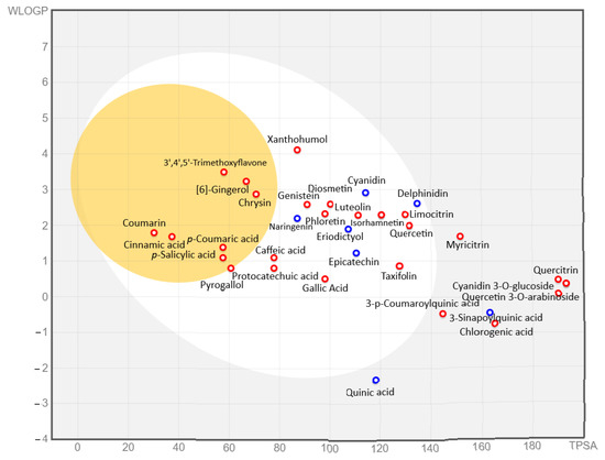 Evaluation of abundant phenolic compounds through the BOILED-Egg method. The blue dots indicate molecules predicted to be expelled from the CNS by P-glycoprotein, and the red dots indicate molecules predicted not to be expelled from the CNS by P-glycoprotein. The egg-yolk area predicts the phenolic metabolites that will passively penetrate the blood–brain barrier. In contrast, the egg-white area predicts which phenolic compounds will be absorbed through the gastrointestinal tract.
