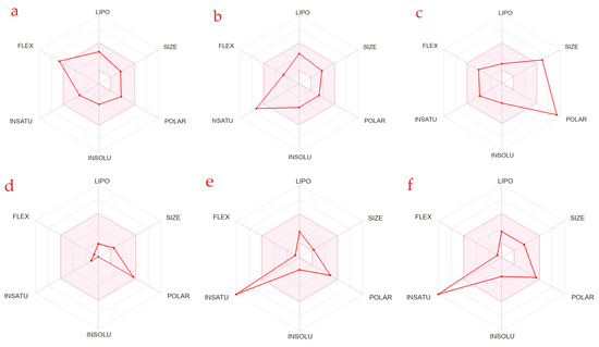 The pink area of the bioavailability radar represents the optimal range for each property. Radars of [6]-gingerol (a), 3′,4′,5′-trimethoxyflavone (b), naringin (c), quinic acid (d), gallic acid (e), and cyanidin (f) were obtained.
