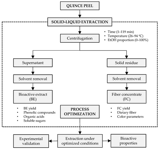Flowchart of the steps involved in the preparation of bioactive extracts (BE) and fiber concentrates (FC) from quince peel and experimental responses considered for process optimization.
