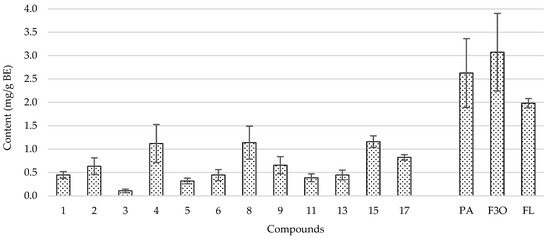 Mean composition in phenolic compounds of quince peel bioactive extracts (BEs) obtained with the six replicates of the center point of the design. 1: cis-3-O-caffeoylquinic acid; 2: trans-3-O-caffeoylquinic acid; 3: 3-O-p-coumaroylquinic acid; 4: cis-5-O-caffeoylquinic acid; 5: trans-5-O-caffeoylquinic acid; 6: (+)-catechin; 8: β-type (epi)catechin trimer; 9: β-type (epi)catechin tetramer; 11: β-type (epi)catechin tetramer; 13: β-type (epi)catechin trimer; 15: quercetin-O-deoxyhexosil-hexoside; 17: kaempferol-O-deoxyhexosil-hexoside. PA: phenolic acids; F3O: flavan-3-ols; FL: flavonols.