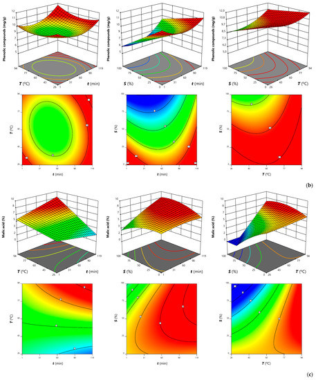 The effects of time (t), temperature (T), and solvent (S) on the different response variables, translated by the model coefficients in Table 3 and Table S3, are discussed below. To visually illustrate the extraction trends, 3D and 2D plots were generated, in which the unplotted factor or factors were kept constant at their individual optimum value. For numerical optimization, to determine the conditions that meet the desired objective (yield maximization), the three independent variables were set within the experimental domain and each target response was “maximized”, keeping the standard error “in range”.