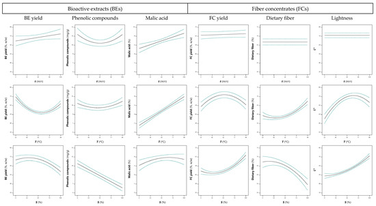 Response plots for the effects of each independent variable on extraction yields, phenolic compounds, and malic acid content of bioactive extracts (BEs), and dietary fiber content and lightness of fiber concentrates (FCs) obtained from quince peel. In each 2D plot, the unplotted independent variables were kept constant at their optimum shown in Table S5.