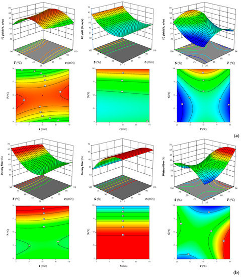 Response plots illustrating the effects of the independent variables on FC yield (a) and dietary fiber content (b) obtained from quince peel. In each plot, the unplotted independent variables was kept constant at its optimum, shown in Table S5.