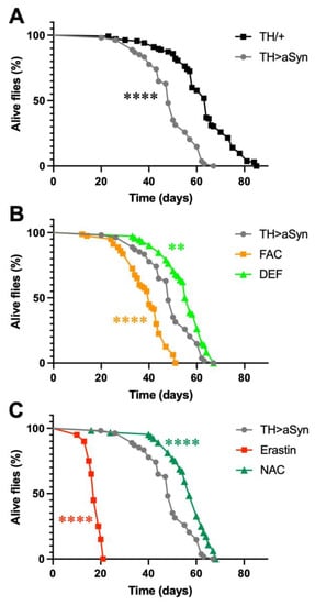 In this work, to selectively over-express α-Syn within dopaminergic neurons, we exploited the GAL4/UAS system, which consists of two parts: the yeast transcription activator protein GAL4 and the upstream activating sequence (UAS), to which GAL4 specifically binds to activate transcription. Both are absent in flies. The GAL4 gene has been placed under the control of the Tyrosine Hydroxylase (TH) gene promoter, which drives the selective expression of GAL4 within dopaminergic neurons, while the UAS controls the expression of the α-Syn gene. In particular, we used a previously generated and characterized Drosophila strain that expresses insect codon-optimized high levels of human α-Syn [17]. Previous work with this line demonstrated that the selective over-expression of α-Syn in dopaminergic neurons was able to induce, in 20-day-old flies, a significant reduction in the number of TH-positive dopaminergic neurons in the protocerebral posterior lateral 1 (PPL1) cluster, relative to the control [17]. In the first series of experiments of this work, we measured the lifespan of this strain and compared it with control flies bearing the same genetic background. We observed that the selective over-expression of α-Syn in dopaminergic neurons strongly reduces the lifespan of flies with a shift of median survival (t1/2) from 64 to 48 days (Figure 1A). Then, to gain insights into the possible involvement of ferroptosis in α-Syn-mediated toxicity, we carried out experiments by over-expressing α-Syn in the presence of either ferroptosis-inducing molecules or anti-ferroptosis compounds. For each compound, the concentration utilized was chosen on the basis of previously published works [18,19,20,21]. First, we tested the effect of iron on α-Syn-dependent toxicity. To this aim, we treated flies over-expressing α-Syn with either 5 mM ferric ammonium citrate (FAC), which increases the endogenous levels of iron [18], or 1 mM DEF, an iron chelator. Interestingly, as represented in Figure 1B, we observed that an increased amount of iron further decreased the fly lifespan (t1/2 = 40 days), while a reduced concentration of this metal ion partially rescued the toxic effects of α-Syn (t1/2 = 56 days). We then evaluated the effects of two molecules able to modulate the levels of GSH by treating flies with either 10 μM erastin, an inhibitor of the cystine-glutamate transporter (system Xc−), which inhibits the synthesis of GSH [22], or 0.1 mM NAC, a precursor for GSH biosynthesis under conditions of GSH deficiency [23]. As shown in Figure 1C, a strong decrease in the lifespan of α-Syn over-expressing flies was observed following the erastin treatment (t1/2 = 17 days), while the presence of NAC partially rescued the α-Syn-dependent toxicity (t1/2 = 57 days).