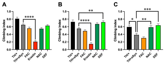 As motor impairment is the main clinical hallmark of PD, we then compared the locomotor behavior through a negative geotaxis-based climbing assay. Considering the different median survival periods previously observed, to obtain a more precise description of the motor defects, we carried out the analysis at different time intervals, namely in 1-, 2-, and 3-week-old flies. Although at 1 week after the eclosion we did not observe fly death in any genotype considered and with any treatment applied, the over-expression of α-Syn in dopaminergic neurons slightly affected the climbing ability of flies with respect to controls, although the difference was not statistically significant (Figure 2A). Interestingly, every treatment used was unable to modulate the effects induced by α-Syn with the exception of erastin, in line with the high toxicity previously observed in the presence of this pro-ferroptosis molecule. A similar trend was also observed in the 2-week-old flies (Figure 2B). Additionally, in this case, the treatment with erastin strongly enhanced the toxicity derived from the presence of α-Syn. It is worth mentioning that since, at this time point, almost 20% of flies were already dead, the analysis was performed with, and refers to, survivors. In contrast to the observations performed 1 week after eclosion, in 2-week-old flies, the treatment with FAC also induced locomotor defects in comparison with control flies, although not at the level of erastin. Moreover, the presence of NAC or DEF exerted a protective role in the climbing activity, which was very similar to control flies. Slightly more pronounced differences emerged in 3-week-old flies (Figure 2C). At this time point, the climbing ability of our control was also slightly affected with respect to 1-week-old flies, but the effects were more evident in flies overexpressing α-Syn, with and without the addition of FAC in the food, while, once again, NAC and DEF exerted a protective action. It is worth mentioning that, in this time frame, the climbing assay was not performed in flies treated with erastin, because no survivors were present, while 3 weeks after the eclosion, less than 5% of dead flies were counted for the other treatments.