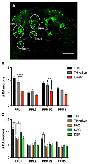 Since motor symptoms associated with PD are the consequence of the preferential degeneration of dopaminergic neurons, we then evaluated the loss of TH-positive neurons in our experimental models [24]. In the protocerebrum posterior of flies, dopaminergic neurons are grouped in clusters with bilateral symmetry (Figure 3A), and as usually done in Drosophila models of PD [24], we considered the following clusters: protocerebral posterior lateral 1 and 2 (PPL1 and PPL2), and protocerebral posterior medial 1/2 and 3 (PPM1/2 and PPM3). Considering that the treatment with erastin strongly affected the locomotor behavior of flies over-expressing α-Syn already 1 week after eclosion, in the presence of this ferroptosis-inducing molecule, the analysis was carried out in 1-week-old flies. Interestingly, the presence of erastin strongly promoted dopaminergic loss in most of the neuronal clusters considered. Moreover, although the effects were not statistically significant with any dopaminergic cluster considered, a neurodegenerative trend was observed also in the α-Syn expressing strain with respect to control flies (Figure 3B).