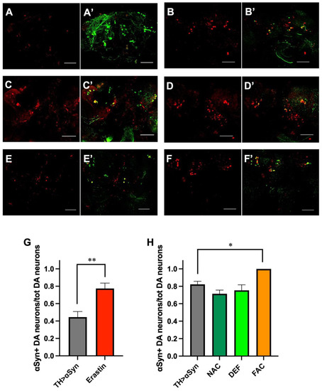 Increasing evidence supports the hypothesis that aggregated forms of α-Syn play an important role in the pathogenesis of PD. Here, we assessed whether the pathological phenotypes observed are in some way correlated to the formation of α-Syn aggregates in our experimental set-up. To this aim, we used a commercially available antibody that has been demonstrated to show high immunoreactivity for all forms of α-Syn aggregates, but showed very weak immunoreactivity toward monomers [25]. As represented in Figure 4A, the over-expression of α-Syn alone led to the formation of aggregates inside dopaminergic neurons already in young individuals and before the appearance of the other pathological phenotypes, even though, as previously mentioned, a trend toward neuronal loss and locomotor impairment was observed in 1-week-old flies over-expressing α-Syn. As expected, the number of dopaminergic neurons containing α-Syn aggregates increased in 20-day-old flies when both the climbing defects and the loss of dopaminergic neurons were more consistent (Figure 4B). In association with the previously described neuronal degeneration, the addition of erastin strongly enhanced the formation of α-Syn aggregates in surviving dopaminergic neurons. Moreover, we observed the presence of α-Syn corresponding signal outside dopaminergic neurons, consistent with the currently accepted view that α-Syn aggregated can be released from dying neurons (Figure 4C). Similarly to erastin, the addition of FAC also led to an increased presence of α-Syn aggregates in surviving dopaminergic neurons (Figure 4D). However, in this case, in addition to the extracellular signal, we also observed the α-Syn corresponding signal localized inside a cell, but not superimposed on the TH-relative signal. We do not have a clear explanation for this observation, which could be related to the fact that, in aged flies, the intensity of the TH corresponding signal is lower in comparison with younger individuals, as also observed in our control flies. While the addition of ferroptosis inducers strongly affected the propensity of α-Syn to form aggregates, the addition of either NAC (Figure 4E) or DEF (Figure 4F) did not show any effect, indicating that the accumulation of cytosolic α-Syn at high concentrations is sufficient per se to promote its aggregation. The quantitative analysis is represented in Figure 4G,H.