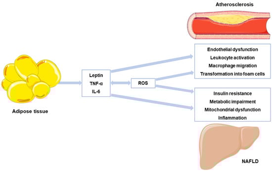 In the context of obesity and lipid overload, adipocytes acquire a proinflammatory phenotype that induces the secretion of adipokines, such as leptin, TNF-α, or IL-6. These adipokines promote ROS production and oxidative stress, which in turn stimulate proinflammatory adipokine secretion. Both types of cellular stress, inflammation and oxidative stress, play a role in the progression of atherosclerosis and non-alcoholic fatty liver disease (NAFLD), promoting several pathogenic processes. ROS: reactive oxygen species; TNF: tumor necrosis factor α; IL-6: interleukin 6. This figure has been edited from Servier Medical Art. Servier is licensed under a Creative Commons Attribution 3.0 Unported License.