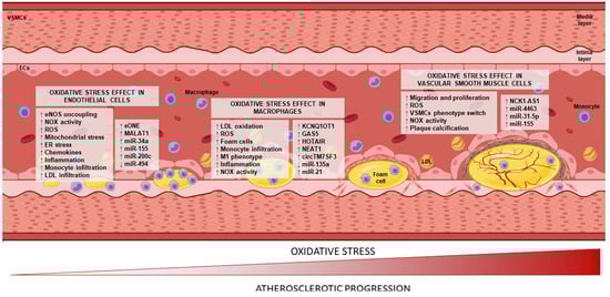 Roles ncRNAs and OxS play in atherosclerotic progression. The OxS effect in endothelial cells, macrophages, and vascular smooth muscle cells at a molecular scale and the regulation of different types of ncRNAs, such as sONE, GAS5, or miR-4463, respectively, are represented in this graphic. eNOS: endothelial nitric oxide synthase, NOXs: NADPH oxidases, ROS: reactive oxygen species, ER: endoplasmic reticulum, LDL: low-density lipoprotein, M1: type-1 macrophages, VSMCs: vascular smooth muscle cells. ↑ up regulation, ↓ down regulation.