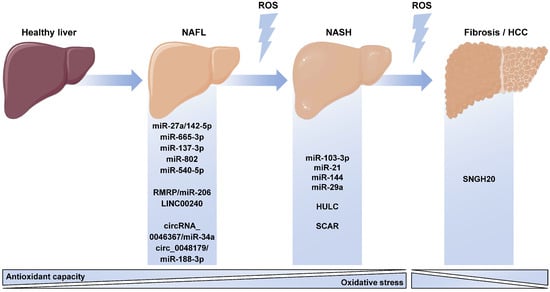 Each stage in the progression on NAFLD is related to disturbances in the pro-oxidant and antioxidant mechanisms, both of which are regulated by ncRNAs. In each stage, miRNAs, lncRNAs, and circRNAs that regulate oxidative stress and display altered expressions are highlighted. NAFL: non-alcoholic fatty liver, NASH: non-alcoholic steatohepatitis, ROS: reactive oxygen species, HCC: hepatocellular carcinoma. This figure has been edited from Servier Medical Art. Servier is licensed under a Creative Commons Attribution 3.0 Unported License.
