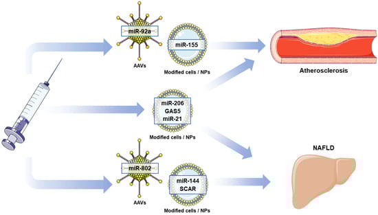 Due to their ability to regulate numerous pathways, ncRNAs are becoming a very interesting tool to develop novel treatments targeting specific tissues (Figure 3). Specifically, for NAFLD, therapeutic strategies targeting the liver are able to selectively affect certain cell types and even subcellular organelles.