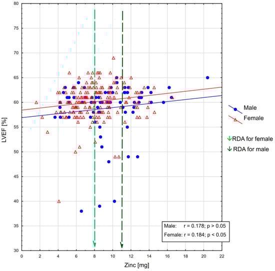 The association between LVEF [%] and zinc intake as well as RDA recommendations in the female and male groups (linear trend line added for easier interpretation).