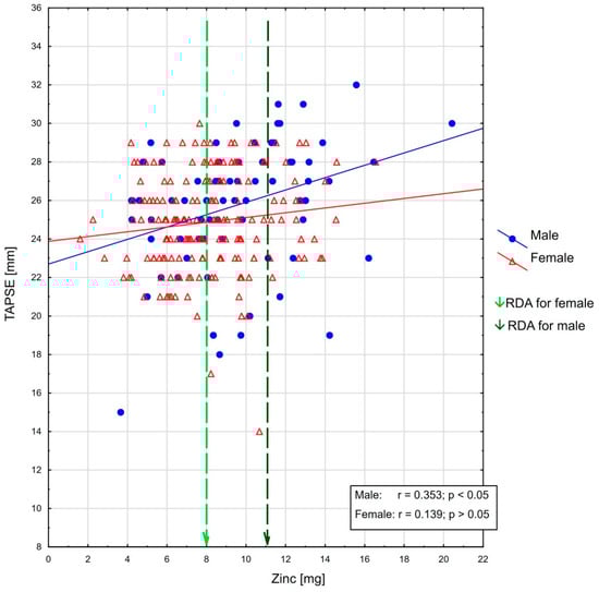 The association between TAPSE [mm] and zinc intake as well as RDA recommendations in the female and male groups (linear trend line added for easier interpretation).