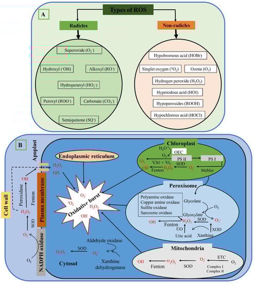 In general, ROS are molecules of oxygen (O2) that have undergone incomplete activation or reduction, as well as being the main product or an O2-containing molecule byproduct that is more reactive than ambient O2. O2 molecules’ electrons or energy transfer forms ROS. In plants, −OH, O2−, 1O2−, and H2O2 are the most common cellular ROS. ROS are produced by cells in both radical and non-radical forms. Radical ROS include superoxide anions (O2−), hydroxyl radicals (−OH), alkoxyl (RO−), hydroperoxyl (HO2−), peroxyl (ROO−), carbonate (CO3−), and semiquinone (SQ−). Non-radical ROS include hypobromous acid (HOBr), singlet oxygen (1O2−), ozone (O3), hydrogen peroxide (H2O2), hypoiodous acid (HOI), hypoperoxides (ROOH), and hypochlorous acid (HOCl). Each form of ROS influences various physiological and biochemical processes in plants that are controlled by various genes and has a distinct oxidative capacity [18]. Different kinds of ROS are shown in Figure 1A, and some of the important ROS are discussed below.