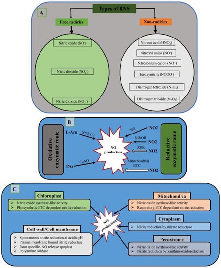 RNS is a collective term that includes radicals such as a nitric oxide (NO−) and nitric dioxide (NO2−) and non-radicals such as nitrous acid (HNO2) and dinitrogen tetroxide (N2O4) [105]. All types of RNS are shown in Figure 3A. Among the above, the most important RNS is nitrogen oxide, which acts as a significant signaling molecule in all living organisms and was proclaimed the “molecule of the year” in 1992 by the journal Science. As compared to ROS, the mechanism of NO production in plant cells is not yet fully explored, which is one of the main obstacles in the investigation of NO as a signaling molecule. In animals, NO is produced mostly by nitric oxide synthase (NOS). Furthermore, though there are many reports of the role of nitric oxide synthase (NOS) in the synthesis of NO in the extracts of different plant species, its occurrence in higher plants has not been explored yet [106]. On the other hand, it has been found in the unicellular alga Ostreococcus tauri [107]. The proposed pathways for NO production are oxidative and reductive. The substrates in the oxidative pathway for NO production are arginine, hydroxylamine, and polyamines [108]. The reductive pathway includes the action of xanthine oxidoreductase (XOR) in the peroxisomes and nitrite:NO-reductase (NiNOR) reductase attached to the membrane [15]. In plants, an important source of NO production is cytosolic enzyme nitrate reductase (NR). It has been suggested that NR plays a vital role in NO production during bacterial defense, in the presence of other pathogens, under drought stress, during cold acclimation, in stomatal regulation, in diminishing the symptoms related to iron deficiency, and in the process related with the growth of the roots [15]. The previous results also show that under normal conditions, NR prefers to convert nitrate to nitrite, and it increases NO production under certain conditions, such as anaerobic conditions, or at a higher level of nitrate [109]. The pathways of NO production are shown in Figure 3B. The cell organelles involved in the production of NO are the chloroplast, mitochondria, cytoplasm, cell wall, cell membrane, and peroxisome [15]. Furthermore, S-nitrosothioles such as S-nitrosoglutathione (GSNO) also play a significant role in the increased NO concentration inside plants, and may act as an NO donor [110]. The sites of NO production are shown in Figure 3C.