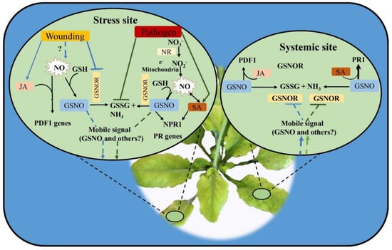 Additionally, it has been revealed that GSNOR may play a significant role in regulating systemic defense responses during pathogenic and wound stress (Figure 4). According to Díaz, et al. [127], wounding, SA, and JA both locally and systemically affect the transcription of the gene GSNOR. Espunya, De Michele, Gómez-Cadenas, and Martínez [125] demonstrated that in wounded Arabidopsis leaves, GSNO levels grew quickly and uniformly, whereas in systemic leaves, GSNO was initially found in vascular tissues before spreading over the parenchyma. These findings imply that GSNO participates in the movement of the wound mobile signal across the vascular tissue. Furthermore, the alternative JA-independent wound-signaling pathway does not use GSNO, whereas JA-dependent wound responses need GSNO accumulation to be activated. In response to diverse abiotic stimuli, GSNOR also modifies SNO levels, which is crucial for resistance and acclimatization [128].