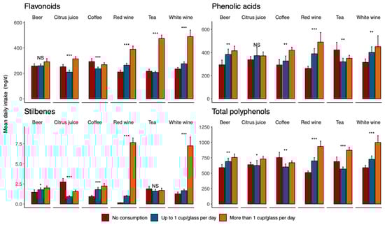 Distribution of mean intake of total and specific classes of polyphenols by intake of polyphenol-rich beverages. * p < 0.05; ** p = 0.001; *** p < 0.001; NS—not significant.