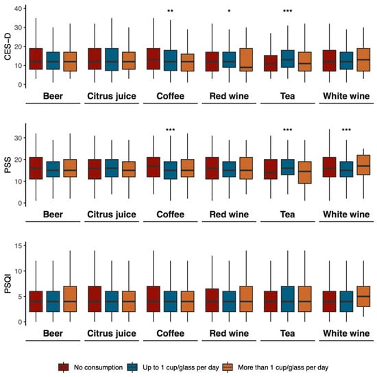 Mean scores of CES-D, PSS, and PSQI by consumption of polyphenol-rich beverages. * p < 0.05; ** p = 0.001; *** p < 0.001.