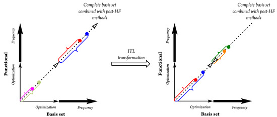 Graphical interpretation of the difference between the standard functional optimization step for frequency computation (left) and the ITL methodology approach (right). For the optimization process, the selected theory level B3LYP/6-311G(d,p) (the purple and dark yellow dots, respectively, corresponding to the functional/basis set notation) was used, with the subsequent use of M062X/cc-pVQZ (the red and blue dots, respectively) for the frequency calculation to describe the standard optimization path. In contrast, the ITL methodology was described by the inversion in theory used; the same M062X/cc-pVQZ was used for the optimization process, while ωB97X-V/pcseg-1 (the green and orange dots, respectively) was chosen as the level of theory for the frequency calculation in this type of approach. The theories mentioned in this heading are exemplary.