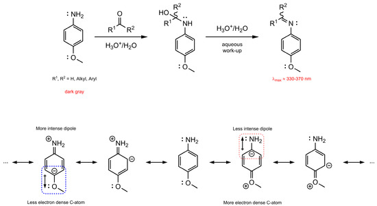 Imine formation with p-Anisidine as the reagent (top). The proton is present in the catalytic concentration and drives the reaction to the product. On the other hand, the resonance structures shown below exhibit a theoretical partial negative charge distribution with respect to the dipoles in the C−N and C−O bonds (as indicated in the schematic) [μ(=OMe+) = 2.523, μ(=NH2+) = 6.984, calculated at the mPW2PLYPD/def2-TZVP level of theory].