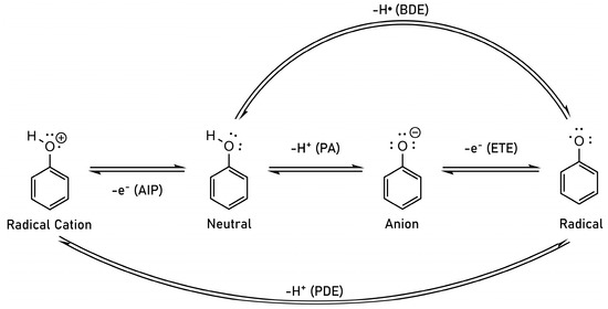 Graphical representation of the antioxidant scavenging processes associated with Equations (1)–(3) (a phenol is used as an example): BDE; bond dissociation enthalpy, PA; proton affinity, ETE; electron transfer enthalpy. Two additional processes are also presented here to fully explain the parameters for antioxidant scavenging activity: the proton dissociation enthalpy (PDE) and adiabatic ionization potential (AIP).