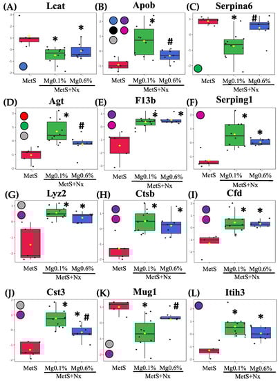 Plasma proteins differentially expressed in the proteomic study. After plasma proteomic study by DIA-SWATH the following proteins were statistically significant after comparison between the experimental groups: (box plots are labeled with gene names that encode the respective proteins). (A) Phosphatidylcholine-sterol acyltransferase (Lcat), (B) Apolipoprotein B-100 (ApoB), (C) Corticosteroid-binding globulin (Serpina6), (D) Angiotensinogen (Agt), (E) Coagulation factor XIII B chain (F13b), (F) Plasma protease C1 inhibitor (Serping1), (G) Lysozyme (Lyz2), (H) Cathepsin B (Ctsb), (I) Complement factor D (Cfd), (J) Cystatin-C (Cst3), (K) Murinoglobulin-1 (Mug1), (L) Inter-alpha-trypsin inhibitor heavy chain H3 (Itih3), (M) Kininogen-1 (Kng1), (N) Antithrombin-III (Serpinc1), (O) Glutathione Peroxidase 3 (Gpx3) (P) Kininogen-2 (Kng2), (Q) Phosphatidylinositol-glycan-specific phospholipase (Gpld1), (R) Fetuin B (Fetub), (S) T-kininogen 1 (Map1), (T) Alpha2-antiplasmin (Serpinf1), (U) Carboxylesterase 1C (Ces1c) and (V) Lumican (Lum). Intensities were normalized to the mean value of each protein. The participation of these proteins in the different biochemical pathways according to reactome analyses is indicated through color circles in the left margin from each graphic. Red circle: Peptide ligand-binding receptors; Orange circle: Detoxification of ROS; Green circle: Regulation of lipid metabolism by PPARalpha; Blue circle: Plasma lipoprotein assembly, remodeling, and clearance; Black circle: Binding and uptake of ligands by scavenger receptors; Grease circle: Metabolism of proteins; Violet circle: Hemostasis and Pink circle: Immune system. * p < 0.05 vs. MetS group and # p < 0.05 vs. MetS+Nx+Mg0.1% group.