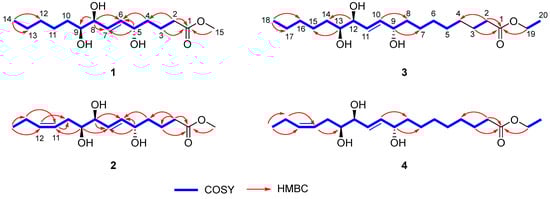 Key 1H-1H COSY and HMBC correlations of 1–4.