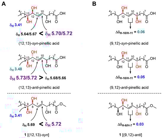 The geometry of the double bond at C-6/C-7 was determined to be E by observing a relatively large coupling constant of H-6/H-7 (15.5 Hz) []. The relative configuration of the three hydroxy groups in 1 was initially assumed to be the same as that of pinellic acid, a natural product isolated from Pinellia ternata [], and further confirmed by intensive comparative 1H NMR data analysis as follow. In 2006, Shirahata et al. synthesized eight possible stereoisomers of pinellic acid and established 1H NMR (in methanol-d4)-based empirical rules for the assignment of the relative configuration of three hydroxy groups []. In brief, a more downfield-shifted 1H NMR signal of H-10 (δH 5.70/5.72) than of H-11 (δH 5.64/5.67) indicated a (12,13)-syn configuration, and the chemical shift of H-13 in (12,13)-syn-form, δH 3.41, was smaller than that in (12,13)-anti-form, δH 3.48 (Figure 3A). Discrimination of the (9,12)-syn/anti configuration was achieved by calculating the ΔδH-10/H-11 value. A relatively smaller ΔδH-10/H-11 value indicated a (9,12)-anti configuration [(9,12)-syn: 0.06 ppm, (9,12)-anti: 0.05 ppm]. By observing a larger δH-6 value (5.72 ppm) than δH-7 value (5.69 ppm), a small δH-9 value (3.41 ppm), and a small Δ δH-6/H-7 value (0.03 ppm) for 1, we were able to determine the relative configuration of 1 as (5,8)-anti and (8,9)-syn (Figure 3). Therefore, the structure of 1 was elucidated as methyl (5R*,8R*,9R*)-5,8,9-trihydroxy-6E-tetradecenoate.