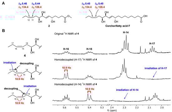 Chaenomester B (2) has the molecular formula C15H26O5, identified from the sodiated molecular ion at m/z 309.1672 [M + Na]+ (calcd. for C15H26O5Na+, m/z 309.1672). The 1H and 13C NMR data of 2 resembled those of 1, except for the presence of double bond signals at δH 5.46 (1H, m, H-12) and 5.44 (1H, m, H-11), and δC 134.4 (C-12) and 126.4 (C-11) for 2 instead of two methylene signals, as observed for 1. The location of the double bond was confirmed at C-11/C-12 by 1H-1H COSY correlations of H-10/H-11 and H-12/H-13 and HMBC correlations of H-9/C-11, H-11/C-10, H-12/C-10, H-13/C-11, H-14/C-12, and C-13 (Figure 2). The geometry of the double bond at C-11/C-12 was suggested to be Z based on the identical 1H and 13C NMR signals of the olefinic functionality in 2 and corchorifatty acid F, which have Z configuration (Figure 4A) []. Hence, the structure of 2 was determined as methyl (5R*,8R*,9R*)-5,8,9-trihydroxytetradeca-6E,11Z-dienoate.