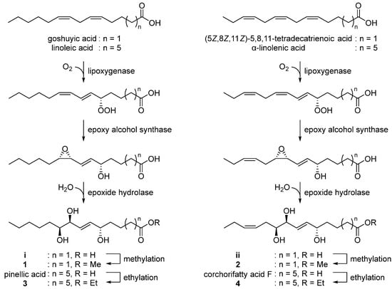With the characterized the structures of 1–4 in hand, we then were able to propose their biosynthetic pathway (Figure 5). Pinellic acid has been previously suggested to be synthesized from linoleic acid by lipoxygenase, epoxy alcohol synthase, and epoxide hydrolase []. Further ethylation on pinellic acid would produce compound 3. Similarly, goshuyic acid, a C14 fatty acid, would be utilized to generate the acid i, and then compound 1 would be synthesized by methylation on i. We propose that compounds 2 and 4 would be produced from (5Z,8Z,11Z)-5,8,11-tetradecatrienoic acid and α-linolenic acid, respectively, by the same enzymatic reaction as those necessary for 1 and 3.