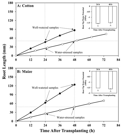 Increase in primary root length for (A) cotton and (B) maize seedlings with time after transplanting to well-watered or water-stressed conditions. Data points indicate times of root length measurement; dashed lines and arrows indicate the times (24 h and 48 h) at which root samples were collected for transcriptomics analyses. Insets show that the low water potential treatments (vermiculite water potentials: cotton, −1.0 MPa; maize, −1.6 MPa) generated equivalent tissue water potentials of approximately −1.6 MPa in the root elongation zone of both species at both sampling times. Data are reproduced with modification from Kang et al. [11], with permission.