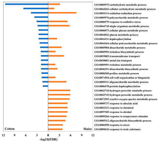 Biological process terms from GO enrichment analysis in the cotton and maize primary root elongation zones at 48 h after transplanting to the water stress treatment. All significant terms in cotton, with their corresponding values in maize, plus 10 additional terms with the highest significances in maize but not represented in cotton, are shown. Cotton: left panel (blue bars); maize, right panel (orange bars).