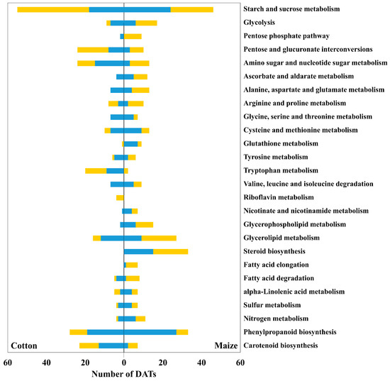 KEGG pathways with top numbers of participating DATs in the cotton and maize primary root elongation zones at 48 h after transplanting to the water stress treatment. The 20 highest ranked pathways in each species (according to the number of participating DATs), together with pathway differences that were distinguished between the species, are presented. Yellow bars indicate DATs with increased abundance; blue bars indicate DATs with decreased abundance. Left panel: cotton; right panel: maize.