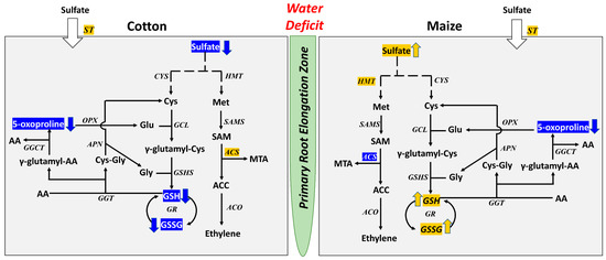 Summary of key changes of encoding transcripts of enzymes and metabolites in the primary root elongation zone of cotton (left panel) and maize (right panel) seedlings growing under water deficit conditions with a focus on sulfur and glutathione metabolism. Italic fonts represent key enzymes that have at least one encoding transcript increased (highlighted in yellow) or decreased (highlighted in blue) in abundance in water-stressed roots compared with well-watered controls. Arrows adjacent to the metabolites indicate increases (yellow) or decreases (blue) in abundance in water-stressed compared with well-watered roots. Enzymes with black font and no arrow beside the metabolite indicate no significant change. Abbreviations: ST, sulfate transporter; Cys, cysteine; Glu, glutamate; Gly, glycine; GSH, glutathione (reduced); GSSG, glutathione (oxidized); AA, amino acid; Met, methionine; SAM, S-adenosylmethionine; MTA, 5′-methylthioadenosine; ACC, 1-aminocyclopropane-1-carboxylate; CYS, cysteine synthase; GCL, glutamate-cysteine ligase; GSHS, glutathione synthase; GR, glutathione reductase; GGT, gamma-glutamyltranspeptidase; GGCT, gamma-glutamylcyclotransferase; OPX, oxoprolinase; APN, aminopeptidase N; HMT, homocysteine methyltransferase; SAMS, S-adenosylmethionine synthetase; ACS, 1-aminocyclopropane-1-carboxylate synthase; ACO, aminocyclopropane-carboxylate oxidase.