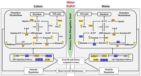 Summary of key changes of encoding transcripts of enzymes and metabolites in the primary root elongation zone of cotton (left panel) and maize (right panel) seedlings growing under water deficit conditions with a focus on osmolyte metabolism and the ABA signaling pathway. Italic fonts represent key enzymes that have at least one encoding transcript increased (highlighted in yellow) or decreased (highlighted in blue) in abundance in water-stressed roots compared with well-watered controls. Arrows adjacent to the metabolites indicate increases (yellow) or decreases (blue) in abundance in water-stressed compared with well-watered roots. Enzymes with black font and no arrow beside the metabolite indicate no significant change. Abbreviations: G-1-P, glucose-1-phosphate; F-6-P, fructose-6-phosphate; Sucrose-6-P, sucrose-6-phosphate; G-6-P, glucose-6-phosphate; Pro, proline; ABA, abscisic acid; SBE, starch branching enzyme; NPP, nucleotide diphosphatase; UGP, UDP glucose pyrophosphorylase; PGM, phosphoglucomutase; SUS, sucrose synthase; SPS, sucrose-phosphate synthase; SPP, sucrose-phosphate phosphatase; INV, invertase; HXK, hexokinase; RS, raffinose synthase; P5CS, delta 1-pyrroline-5-carboxylate synthase; PYL, PYR1-like; PP2C, protein phosphatase 2C; SnRK2, SNF1-related protein kinase; GRAM-P, GRAM domain-containing ABA-responsive protein; GCR2, G protein coupled receptor 2.