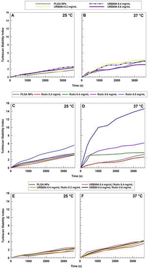 Turbiscan Stability Index (TSI) profiles of PLGA nanoparticles (NPs) prepared with various amounts of URB894 (0.2–0.6 mg/mL) or/and rutin (0.2–0.8 mg/mL) as single agents or as multidrug carriers (0.4 mg/mL of URB894 and 0.2–0.6 mg/mL of rutin, respectively) as a function of time and temperature. (Panels (A,C,E)): 25 °C. (Panels (B,D,F)): 37 °C. The reported result is a representative experiment of three independent tests.