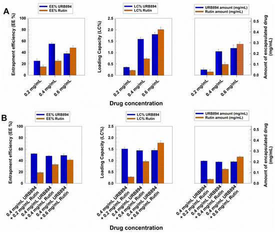 Entrapment efficiency and loading capacity of URB894 and rutin within PLGA nanoparticles encapsulated as (A) single agents or (B) in association in multidrug formulations as a function of the drug concentration used. Results are reported as the mean of three different experiments ± standard deviation.