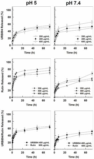 The evaluation of the rutin-loaded samples evidenced a peculiar biphasic release pattern in this case too, a trend in good agreement with other PLGA-based formulations containing the natural compound that have already been described [16,17,18]. However, at pH 5, 60–70% of rutin was released during the first few hours (Figure 5). Contrarily, the release of rutin at pH 7.4 was significantly lower with respect to that previously discussed. These different trends can be explained as a consequence of the solubility of rutin at different pH conditions [34,35,36,37].