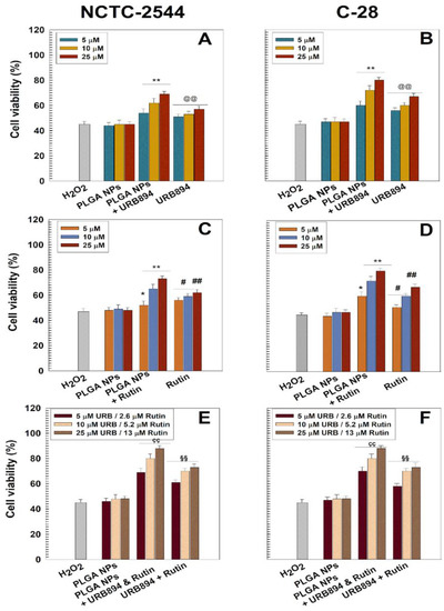 Cell viability during hydrogen peroxide-induced oxidative stress of URB894 (Panels (A,B)) and rutin (Panels (C,D)) as free form or encapsulated within PLGA nanoparticles (NPs) as single agents or as multidrug formulations (Panels (E,F)), evaluated by MTT testing on NCTC-2544 and C-28 cells as a function of the drug concentration. Results are reported as the mean of three different experiments ± standard deviation. The cells were incubated with different concentrations of drug(s) for 24 h and then treated with H2O2 (800 μM) for 1.5 h. *,#,ç p < 0.05 and **,##,çç,§§,@@ p < 0.001: vs.·H2O2 800 μM.