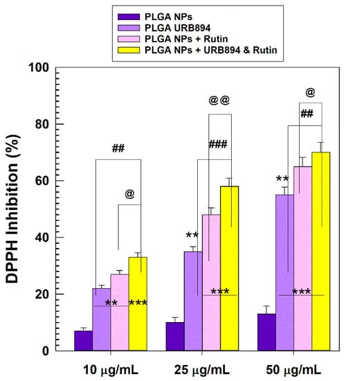 The evaluation of the antioxidant properties of URB894 and rutin encapsulated within PLGA nanoparticles was also performed by means of DPPH assay (Figure 7). The results confirmed that the encapsulation of URB894 and rutin did not compromise their radical scavenging activities. In particular, the use of 50 µg/mL of URB894 or rutin showed a percentage of DPPH inhibition of 55% and 65%, respectively, when they were encapsulated as single agents (Figure 7). The multidrug formulation evidenced a slight increase in this parameter (70%), confirming the rationale of using their association to promote a better pharmacological outcome.