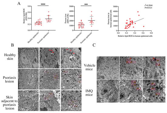 To prove the existence of ferroptosis in PV patients, we investigated the classical ferroptosis-related markers. Firstly, we measured the level of lipid ROS and ferrous iron in the epidermal cells in PV patients. As expected, our results showed that compared to healthy controls, the level of intracellular lipid ROS and ferrous iron in epidermis of PV patients were increased, and there was a significant positive correlation (Figure 1A). Ferroptosis was distinguished from other types of programmed cell death such as pyroptosis, necrosis, and autophagy mainly, reflected in morphological changes. Ferroptotic cells manifested as the volume of mitochondria reduced, mitochondria crista decreased or disappeared, the membrane density of mitochondria increased, or the outer membrane of mitochondria ruptured, shown through transmission electron microscopy [,,]. Transmission electron microscopy ultrastructure analysis presented that the epidermis cells of PV patients exhibited more ferroptotic ultrastructure than those with healthy epidermis (Figure 1B), which means that ferroptosis was activated in the epidermis of the psoriatic lesion. More interestingly, mitochondria in the normal-appearance skin adjacent to the psoriasis existed with increased density of partial membrane. Similar to the human subjects, the skin lesion from IMQ-induced psoriasis-like mice also showed characteristically morphological features of ferroptosis (Figure 1C). In summary, these results demonstrated that ferroptosis was activated in the epidermis of psoriatic lesions.