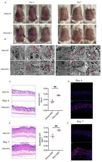 The mice were intradermally injected with 2 mg/kg of RSL3 dissolved in 50 μL saline or 50 μL saline alone daily after application of IMQ for 6 consecutive days. On day 4 and day 7, skin lesions were analyzed by histopathology, transmission electron microscopy, and immunofluorescence analysis.