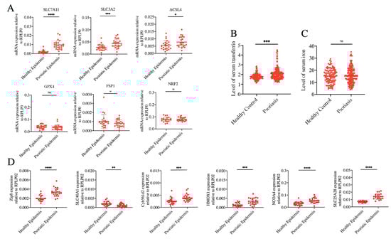 Stage of lipid peroxidation and iron metabolism in the epidermis of PV patients. (A) Lipid-peroxidation-related genes in the psoriatic epidermis (n = 23) and normal controls (n = 24). (B,C) Levels of serum iron and serum transferrin in psoriasis patients (n = 177) and normal controls (n = 115). (D) Iron-metabolism-related genes in the psoriatic epidermis (n = 23) and normal controls (n = 24). Data represent the mean ± SEM: ns p > 0.05, * p < 0.05, ** p < 0.01, *** p < 0.001, and **** p < 0.0001. Two-tailed Mann–Whitney U test was used.