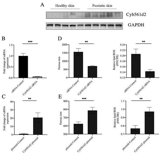 Level of lipid ROS and iron in HaCaT cell. (A) Protein level of Cyb561d2 measured by Western blot in psoriatic skin lesions (n = 5) and normal controls (n = 5). (B) Test for knockdown efficiency of Cyb561d2 siRNA in HaCaT cells. (C) Test for overexpression efficiency of Cyb561d2 plasmid in HaCaT cells. (D) Levels of intracellular ferrous iron and levels of lipid peroxidation in HaCaT cells transfected with Cyb561d2 siRNA (n = 3) and control siRNA (n = 3). (E) Levels of intracellular ferrous iron and levels of lipid peroxidation in HaCaT cells transfected with DNA plasmid (n = 3) and control plasmid (n = 3). Data represent the mean ± SEM: ** p < 0.01, and *** p < 0.001. Two-tailed Mann–Whitney U test was used.