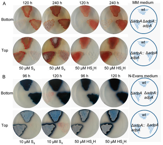 The ΔadpA strain was more sensitive to RSS than wt. (A) Phenotypes of S. coelicolor M145 (wt), ΔadpA, and ΔadpA::adpA grown at 30 °C on MM agar containing 50 µM S8 or 50 µM HSnH. The red pigment was undecyl prodigiosin in the colonies. (B) Phenotypes of wt, ΔadpA, and ΔadpA::adpA grown on N-Evans agar plates containing 10 µM S8 or 50 µM HSnH. The blue pigment is actinorhodin in the colonies. Images were taken at 120 h and 240 h (panel (A)) or 96 h and 120 h (panel (B)), and the views from top and bottom sides of the plates.