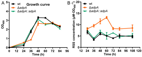 The accumulation of RSS content in ΔadpA. (A) The growth curve of S. coelicolor M145 wt (black bar), ΔadpA (red bar), and ΔadpA::adpA (green bar) cultured in YBP medium. OD450 was checked to represent the growth. (B) Deletion of adpA increased intracellular RSS. RSS concentrations of wt (black bar), ΔadpA (red bar), and ΔadpA::adpA (green bar) were detected at the indicated times.