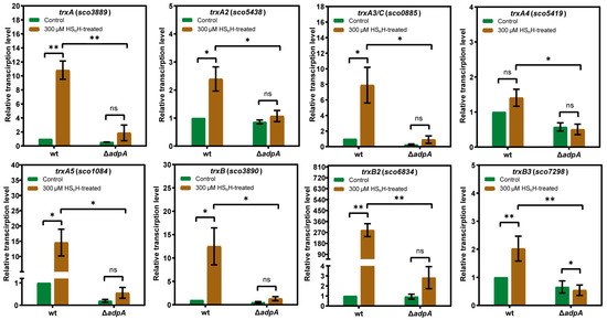 To examine whether the expression of thioredoxins was induced by RSS, we performed HSnH induction experiments. The wt and ΔadpA strains were cultivated in liquid YBP medium for 36 h (exponential phase). 300 µM HSnH was added, and the cultivation was continued for 1 h. Untreated cultures were used as the controls. Cells were harvested for RNA extraction and RT-qPCR analysis. In wt, the expression levels of trxA (sco3889, Gene ID: 1099325), trxB2 (sco6834, Gene ID: 1102273), and trxB3 (sco7298, Gene ID: 1102736) were significantly increased after HSnH treatment; the expression levels of trxA2 (sco5438, Gene ID: 1100878), trxA3/C (sco0885, Gene ID: 1096308), trxA5 (sco1084, Gene ID: 1096507), and trxB (sco3890, Gene ID: 1099326) were less significantly increased, while the expression level of trxA4 (sco5419, Gene ID: 1100859) was not significantly increased (Figure 3). In ΔadpA, for except trxB3 (sco7298), other thioredoxins did not show significantly increased expression after HSnH treatment. For each thioredoxin, the expression level in wt was significantly higher than that in ΔadpA after HSnH treatment (Figure 3). These results indicate that RSS-containing compounds induce the expression of thioredoxins, which requires the presence of AdpA.