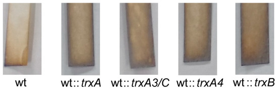 The effect of overexpression trx genes in S. coelicolor M145 on H2S production. H2S production by S. coelicolor M145 wt, wt::trxA, wt::trxA3/C, wt::trxA4, and wt::trxB in YBP medium between 24 h and 48 h culture was detected in the gas phase with lead–acetate paper. The experiment was repeated at least three times.
